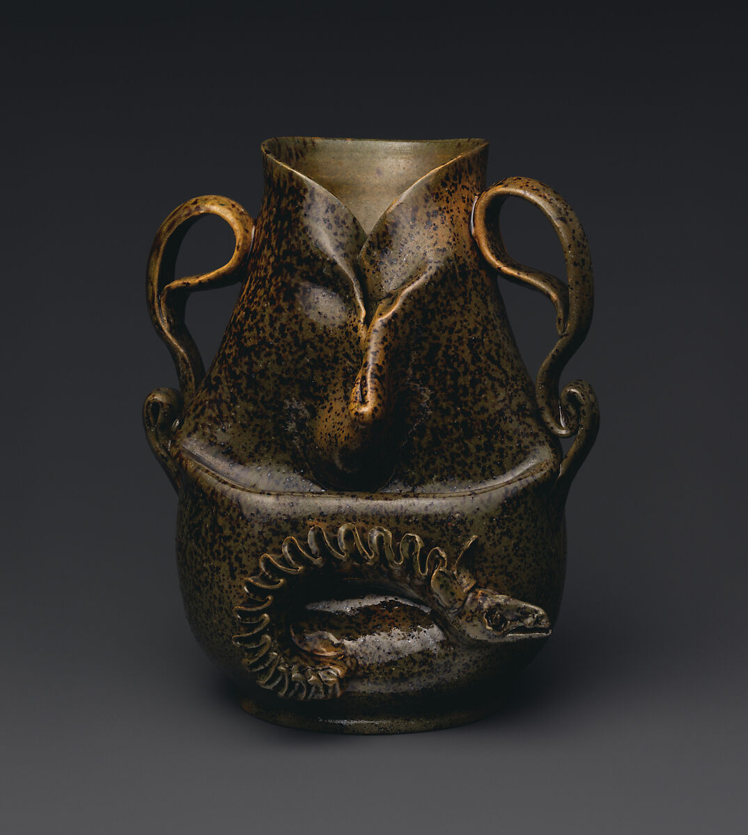 Ohr was a colorful character, and his quirky pottery became one of the added tourist attractions on Mississippi’s gulf coast. Self-proclaimed the "Greatest Art Potter on Earth," he was well ahead of his time, and the vases that he deemed "worth their weight in gold" would not command such prices until a few decades ago. Barely ten years after he began making such vases, Ohr closed his pottery, and packed up his pots, literally not to be discovered for another 50 years. Both of these vases came virtually straight from the artist’s cache, and were purchased by Martin Eidelberg, the donor, when the rediscovery of art pottery was in its infancy in the early 1970s.