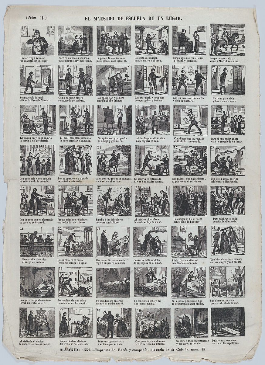 - Title: Broadside with 48 scenes depicting the experiences of a schoolteacher in an unknown small town ('de un lugar')