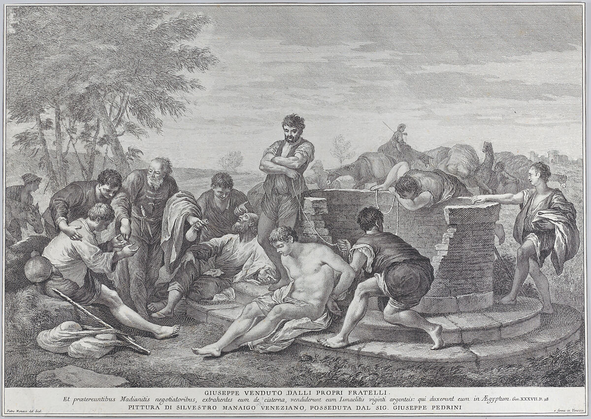 - Title: Joseph being sold into slavery by his brothers, who sit around a well dividing up the coins