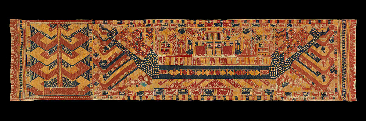 This is an exceptional ceremonial banner (palepai) from Semangka Bay in Lampung, Sumatra, Indonesia. Woven with cotton and metallic wrapped yarns in the supplementary weft technique this is a particularly rare and exceptional example. Also known as ‘ship’s cloths’ due to their iconography which often depict large ships and reflects the vibrant cosmopolitanism of the area, this palepai is a particularly rare and exceptional example featuring a single vessel in blue with a complex array of iconography typical of the genre, here picked out in red thread and other contrasting colors to highlight the designs. These include a boldly graphic area of densely formed interlocking blocks of scrolling – a feature of the left of the textile that is echoed at either side of the prow and stern of the central vessel – and emulates the dynamic rise and fall of the waves as the vessel moves through the water as well as a more literal representation of the long oars which propel the vessel through the sea. Human figures of varying dimensions populate the deck standing amidst fantastical creatures featured with mounted riders that are repeated along the upper and lower borders of the textile itself as a framing device. A remarkable level of patterning embellishes the design of the vessel itself at stern and prow creating a dynamic and highly animated narrative scene.