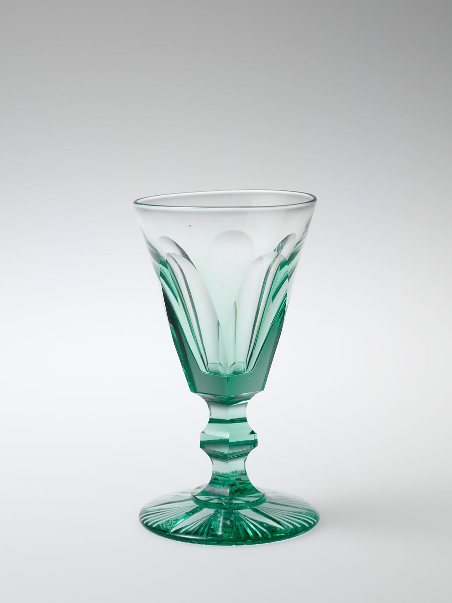 The Jersey Glass Company exhibited at the Franklin Institute in 1836 and was awarded a silver medal for its exceptional “fluted decanters” of cut glass. The superior quality of the distinctive green glass and the precision of the panel and star cutting are evident in this service.