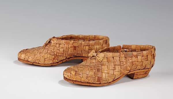 The weaving of birch bark splints into baskets and other utilitarian items is an ancient Scandinavian tradition which continues to this day. Shoes of woven birch bark are a traditional form of Finnish and Scandinavian apparel which dates back to prehistoric times. Generally rather coarse in construction and conception, the basic style has changed little over the millennia. This interesting and highly refined variation incorporates the fashionable Western elements of the solid sole, tapered heel and bow trim at the throat.