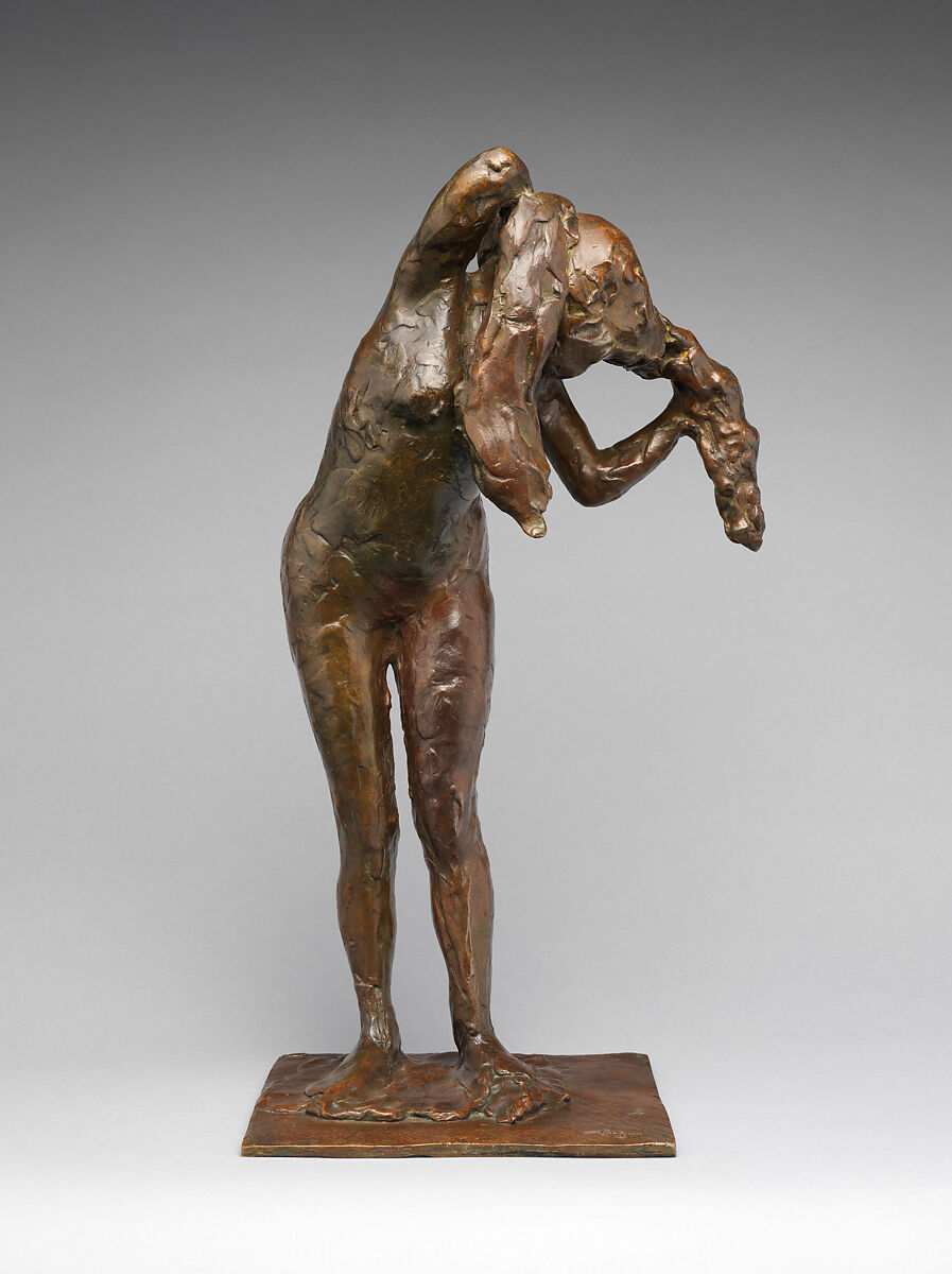 Upon Degas's death in 1917, more than 150 figurative sculptures were found in his studio. Most were made of fragile wax, clay, and plastiline (a wax- and oil-based modeling material). Many had deteriorated. Only a few were preserved in copies that had been cast from them in plaster. Except for the wax Little Fourteen-Year-Old Dancer (Washington: NGA) none of these sculptures had been publicly exhibited during the artist’s lifetime.