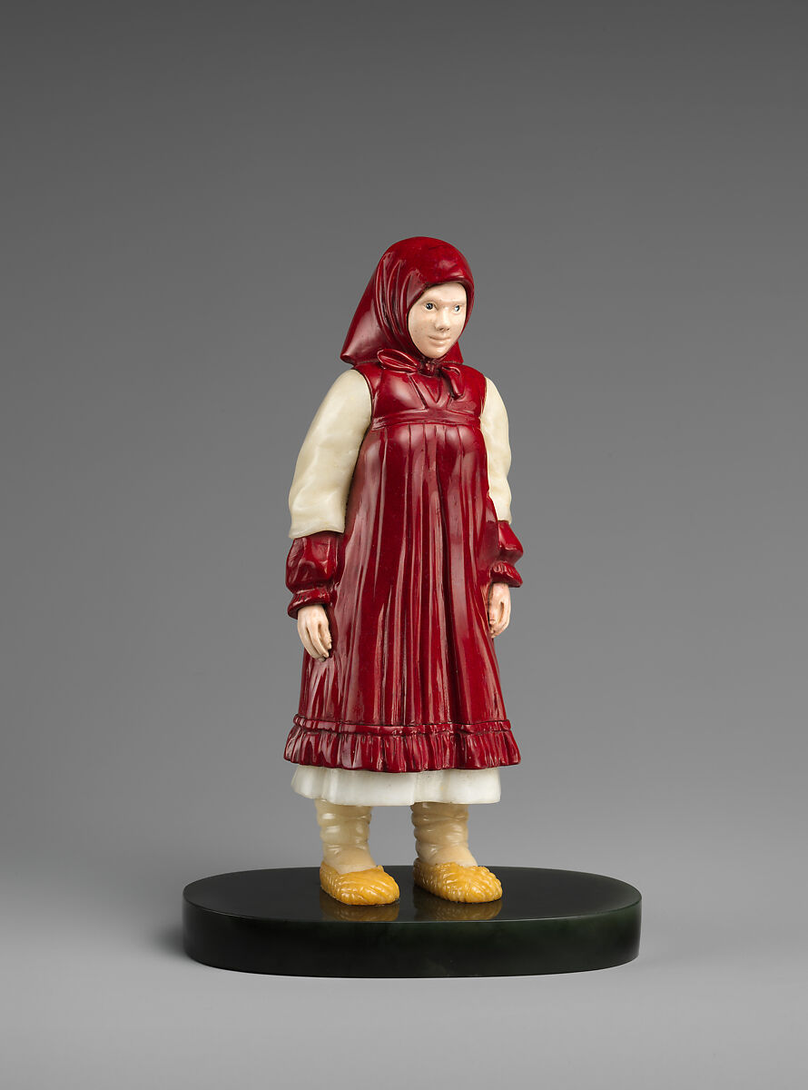 This figurine is an exceptionally rare extant example of a Russian folkloristic figure composed of Siberian hardstones and purpurine. The deep crimson material known as purpurine was a variety of a similar chemically made glass known in the eighteenth-century workshops of Murano, near Venice. The manufacture of purpurine would appear to have been brought about by the crystallization of a lead chromate in a glass matrix, resulting in an extremely durable material of great beauty, on account of both the intensity and the unique depth of its sang-de-boeuf color. The House of Fabergé seems to have had the exclusive use of this remarkable material. The mark C. FABERGÉ, inscribed in English, indicates that the object was destined for the firm's shop in London.
