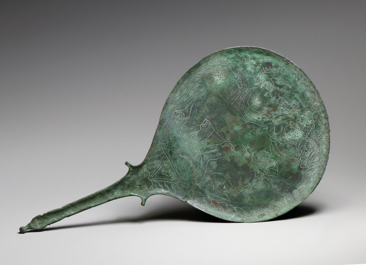 Most Praenestine mirrors have a distinctive pear-shaped disc, unlike the circular discs of mirrors produced in Etruria. In this example, a product of the same workshops that made the cistae in this case, the female figure driving a chariot is probably Thesan (Greek: Eos), the Etruscan goddess of the dawn.