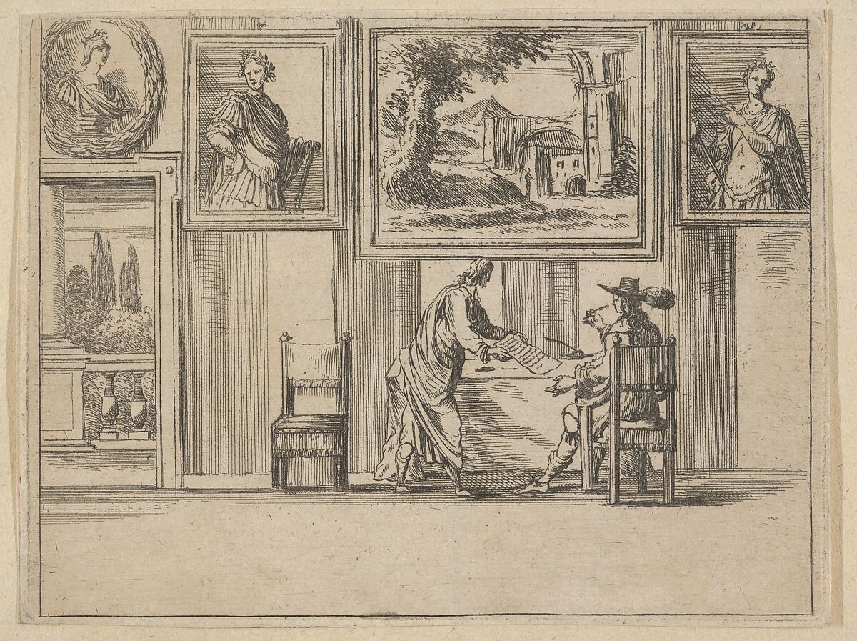 This print is from L'Idea di un Principe ed Eroe Cristiano in Francesco I d'Este, di Modena e Reggio Duca VIII [...] collected in an album of brown boards. Four prints are hinged on each page of the album with a seventeenth- or eighteenth-century inscription pasted beneath the print on the album page. The prints are etched in the manner of Callot and illustrate Francesco I d'Este's virtuous nature as a ruler in battle, in religious matters, and in daily life. Three of the prints are signed by Jean Sauvé, who presumably worked with Fenice on the execution of the illustrations for this book. There are sixty-seven copper plates and forty-five preparatory drawings in the Museo Civico di Modena.