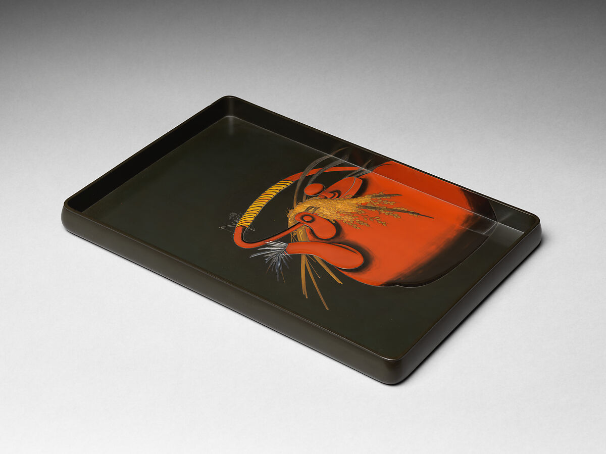 For the ground of this tray, Zeshin created a dark-green background by scattering bronze and charcoal powders on the uncured lacquer. He then polished the surface to give it the luster and mottled tone of aged bronze ware. He used red lacquer, combined with black lacquer shading, to paint the large bronze tea kettle used by farmers to carry tea to the fields during the festive autumn harvest. Straw is stuffed into the kettle spout, perhaps to keep out insects such as the grasshopper clinging to the handle. Freshly harvested rice stalks are painted in raised gold, silver and blue-gold, an alloy of gold and silver. There are other trays with this design, indicating that the Irving example was originally one of a set of five. The tray is inscribed: Gyonen nanajusan okina Zeshin [Zeshin at the age of seventy-three].
