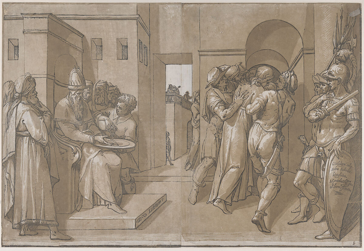 - Title: Pilate at the left washing his hands (left side of sheet)