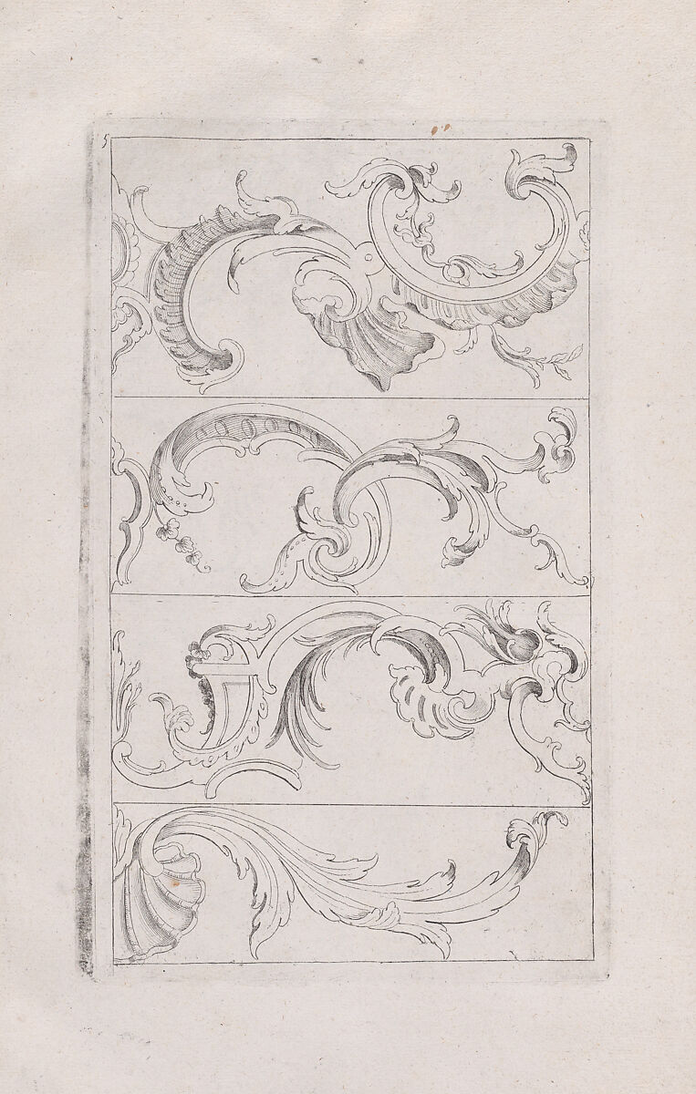 Plate 4 of the series 'Livre Nouveau de Prinsipes d'Ornemens', consisting of a title page and seven plates of rudimentary ornament designs to instruct (young) artists in how to design and delineate ornaments. This plate consists of four friezes with designs made up out of C-volutes, bandwork, simple rocaille ornaments and shell motifs and acanthus leafs.
