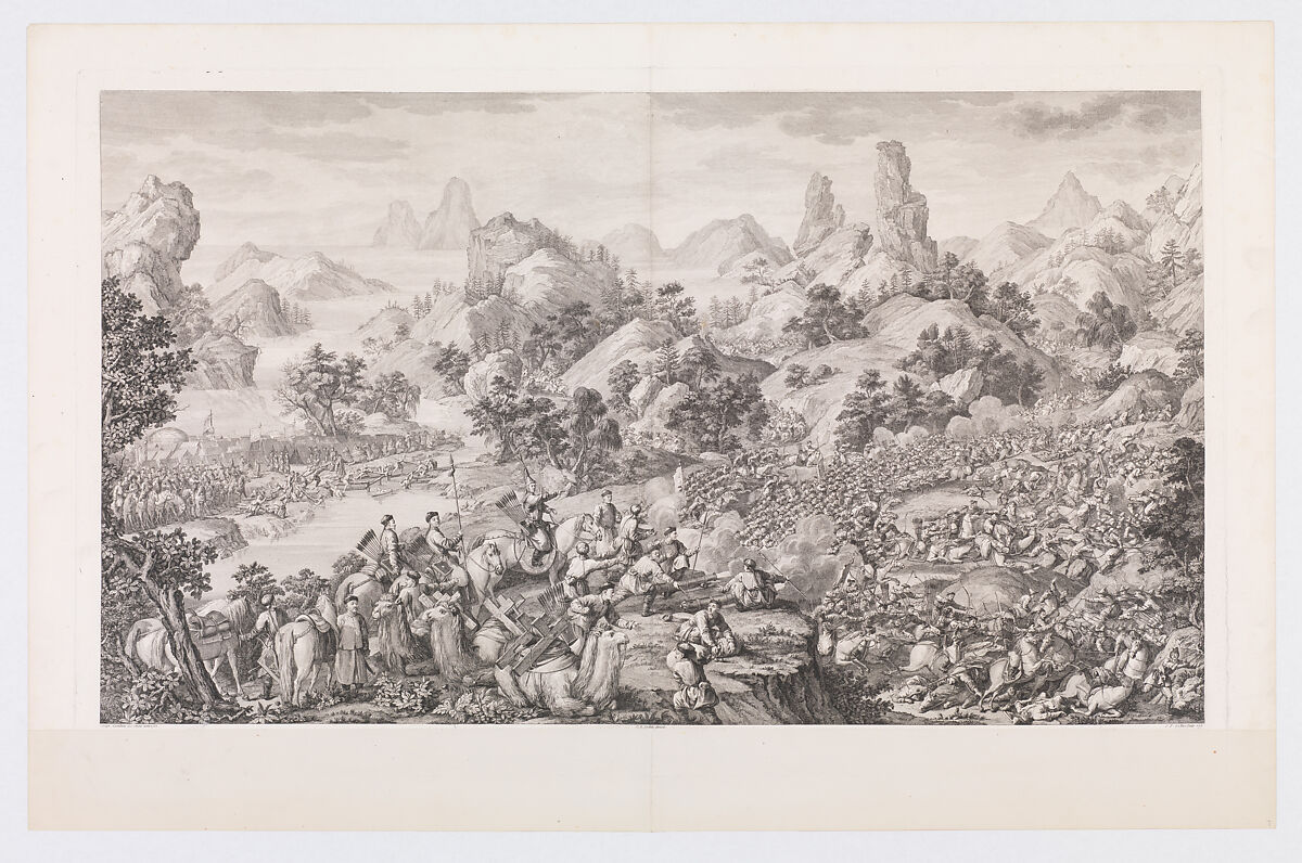 Part of a set of sixteen, "The Lifting of the Siege of the Black River Camp" was commissioned by the Qianlong Emperor in 1765 to commemorate Manchu victories (1755-59) over the Eleuths, the Dzungars, and other Central Asian peoples in the present-day region of Xinjiang. Made under the direction of Charles-Nicolas Cochin (1715-1790), the prints, which follow reduced-scale copies of paintings by Jesuit artists working in Beijing, were etched and engraved in France from 1767 to 1774 by the finest printmakers at the court of Louis XV. The Chinese merchants of Canton (present-day Guangzhou) paid for the copper plates and two hundred sets of prints to be delivered to China, with only a few sets retained in Paris.
