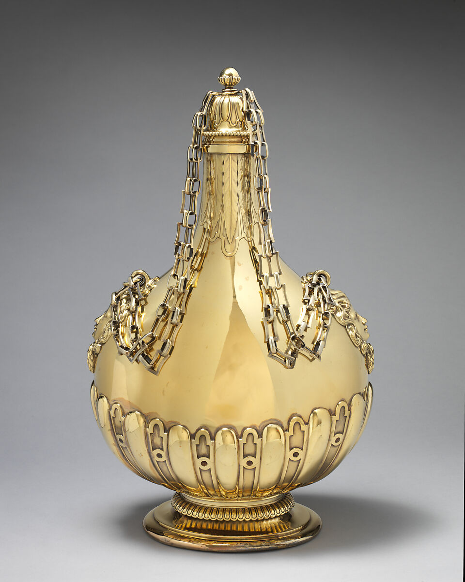 This impressive pair of Victorian pilgrim bottles look back at a form derived from seventeenth-century wine bottles; these examples were only intended to be used as part of a grand display in the dining room. Garrard was one of the most important jewelers in London; in fact, Queen Victoria appointed Garrard the very first Crown Jeweler only a few years after his firm produced these bottles.