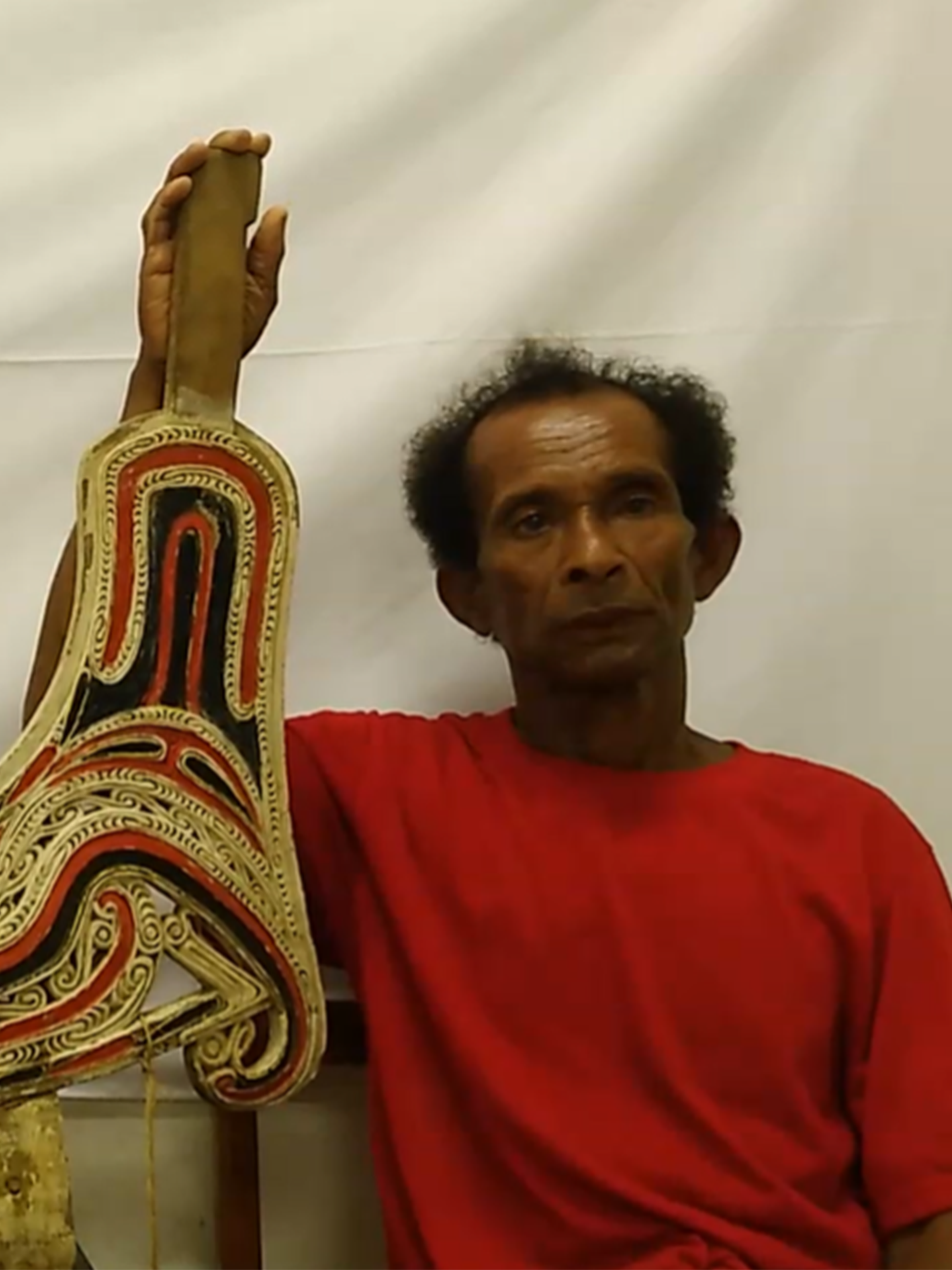 Yustinus Sempah is a village elder, storyteller, and painter from Er village in West Papua. His drawings and paintings demonstrate his extensive knowledge of Asmat myth. Several of the myths that he has recorded have been gathered into an unpublished book by Fr Vincent Cole, an American priest with the Catholic Mission in Asmat. Yustinus himself undertook training as a Catholic priest and worked as a dormitory head in one of the Catholic schools in the area.