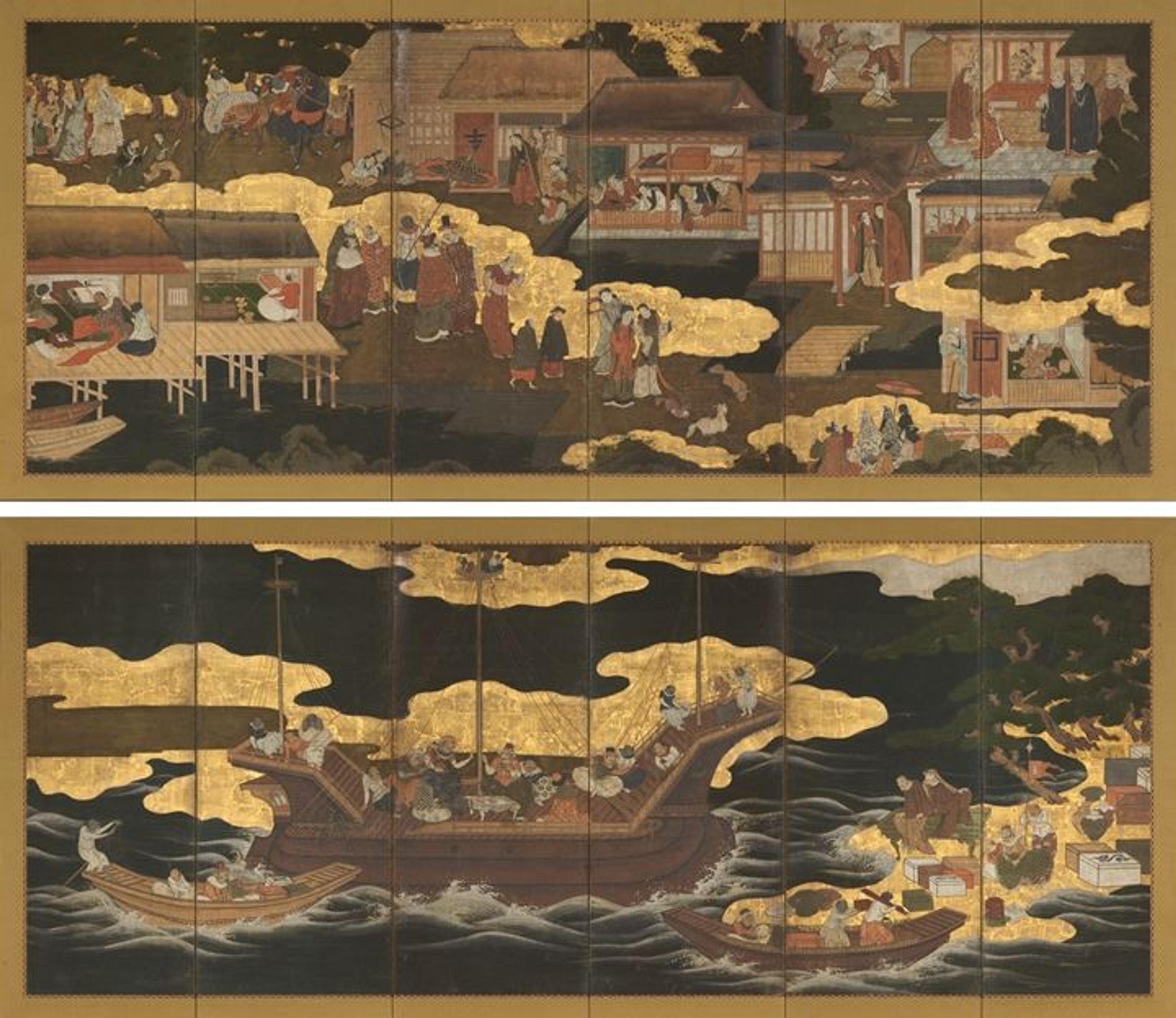 南蛮屏風 (Arrival of the Europeans), first quarter 17th century. Edo period (1615–1868), Japan. Pair of six-panel folding screens; ink, color, gold, and gold leaf on paper, each 41 3/8 in. x 8 ft. 6 5/8 in. (105.1 x 260.7 cm). The Metropolitan Museum of Art, New York, Mary Griggs Burke Collection, Gift of the Mary and Jackson Burke Foundation, 2015 (2015.300.109.1, .2)