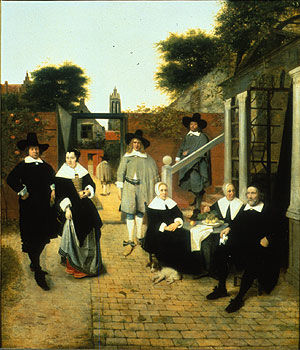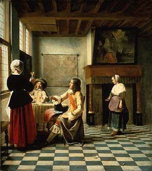 This much admired picture has been considered a breakthrough for De Hooch and Vermeer because of its use of perspective to describe naturalistic space. What the floor tiles, fancy fireplace, and scale of the room actually reveal is De Hooch's attempt to elevate the tone of his "merry companies" (compare the other works by the artist on this wall) by borrowing design ideas from Van Bassen and other painters of palatial architecture in Delft and The Hague. Applying this patrician veneer cost De Hooch more troubleto judge from this composition's several correctionsthan did the consistent flow of light across the space.