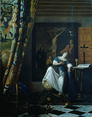 There is little evidence of naturalistic description in the painting apart from that found in isolated objects, in particular the terrestrial globe (symbol of the authority of the Catholic faith) and the glass sphere (symbol of heaven or God the Father). The contemporary observer was expected to proceed from one motif to another, contemplating the meaning of each one and its relation to the whole. In the foreground the "cornerstone" of the Church (Christ) crushes a serpent (the Devil), which, along with the apple, refers to original sin. Christ's redeeming sacrifice is represented by a large painting known from versions by Jacob Jordaens, one of which Vermeer evidently owned.Triumph of Justice of the late 1650s (Mauritshuis, The Hague). Dutch painting in general was moving toward a more classical approach. In adopting this idealizing manner Vermeer was responding to current fashion and at the same time returning to his roots in Delft.