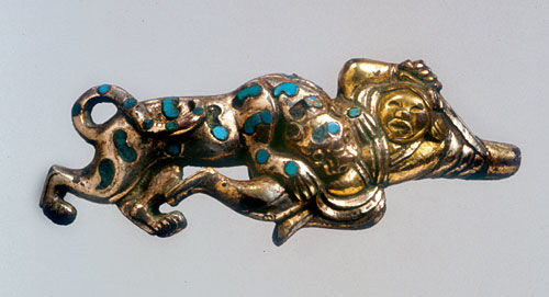 Gold inlaid with semiprecious stones; H. 3 in. (7.6 cm), W. 4 5/8 in. (11.7 cm)