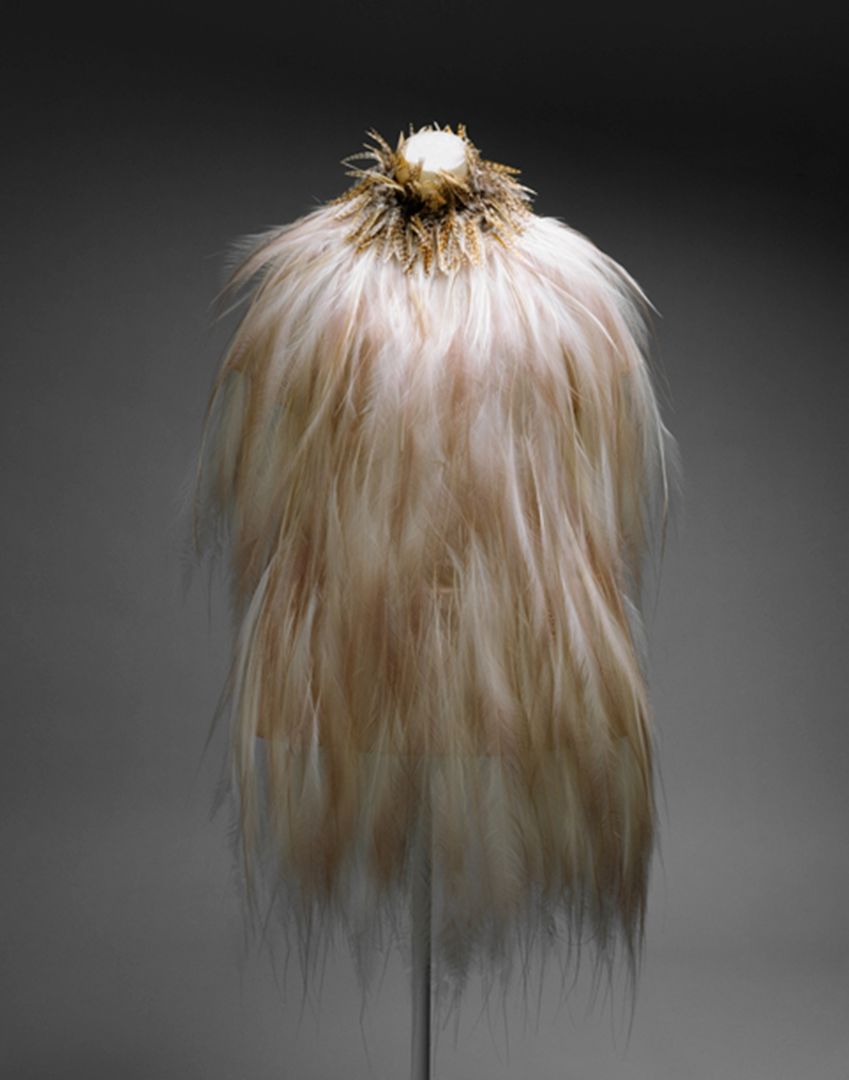 The power of plumage to signify both vigor and ardor has a long history in fashion. While plump ostrich feathers dangling from wide-brimmed beaver hats announced the physical and sexual confidence of the seventeenth-century cavalier, delicate egret feathers woven into the coiffure of an eighteenth-century courtesan proclaimed her sensual exoticism. In the exhibition, these historical references are articulated through the wondrous "Birds of Paradise" creations by renowned milliners Philip Treacy and Stephen Jones. The fantastical feathered costumes of Las Vegas showgirls—iconic symbols of femininity born out of male fantasies of the "kept" or "caged" woman—are also shown alongside equally dazzling and sexualized creations by Jean Paul Gaultier and Rudi Gernreich. Among the highlights of the exhibition are examples of feathers used for display and attraction in male apparel, such as Jimi Hendrix's peacock feather waistcoat, a psychedelic manifestation of the Restoration fop.
