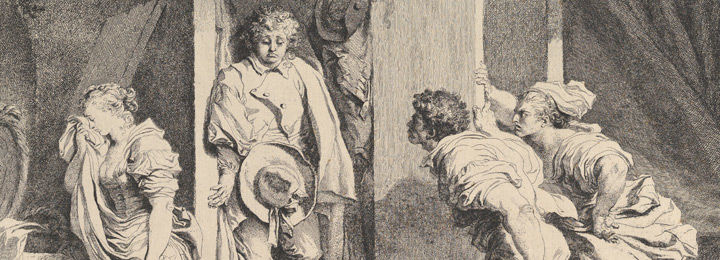 The artist's third etching campaign yielded his largest and most ambitious plates. The last four prints, all dating to 1778, are again the product of a teaching relationship: this time Fragonard was the master and Marguerite Gérard, his sister-in-law, was the student. Picking up the etching needle to demonstrate the technique to his teenage pupil, he must have found himself newly energized by its possibilities. The project's crowning work—The Armoire, a dramatic scene of angry parents interrupting their daughter's tryst—is one of the great achievements of printmaking in 18th-century France.