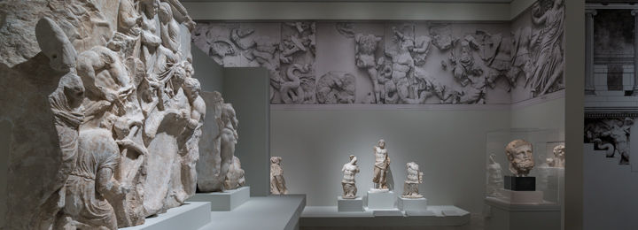 The sculptural and architectural elements from the Great Altar as well as the large-scale sculptures from its terrace presented here convey the dramatic style of the monument. Among them are acroteria, sculptures in the round that crowned the roof, and slabs from the smaller frieze in the altar's inner court that narrates the myth of Pergamon's foundation by the hero Telephos, son of Herakles and legendary ancestor of the Attalid kings.