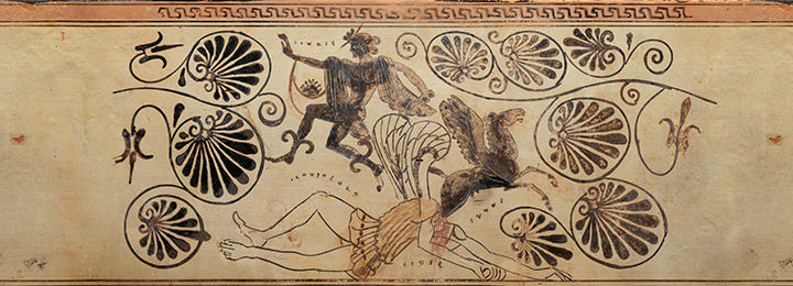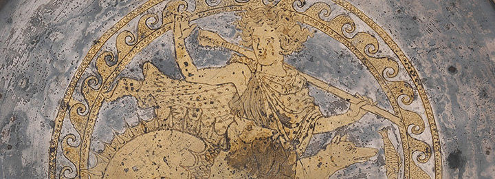 Returning home after the Trojan War, Odysseus and his crew encountered Scylla, a sea monster who, together with Charybdis, a giant whirlpool, terrorized sailors. Homer tells us that Scylla had twelve legs and six long necks with ghastly heads. Yelping like a puppy (skylax), she snatched sailors from ships passing her fog-bound cave and devoured them.