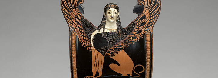 The sphinx, a mythological creature with a lion's body and a human head, originated in Egypt and has been known throughout the eastern Mediterranean since the Bronze Age. The Greeks represented the sphinx as a winged lioness with a woman's head. Statues of sphinxes flanked the entrance of tombs or crowned grave markers, guarding against and punishing those who would disturb the dead. On one stele, noted for its polychromy, the sphinxes' femininity is emphasized with necklaces and elaborate diadems worn on long, elegantly coiffed hair.