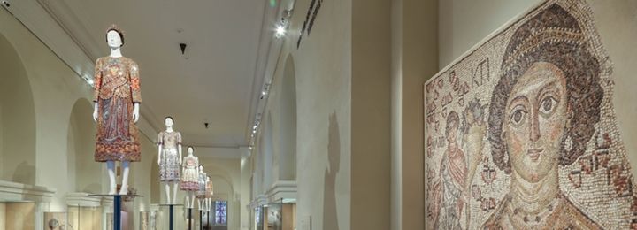 On display in this gallery are five dresses from Dolce & Gabbana's autumn/winter 2013–14 collection, which was inspired by the dazzling mosaics of the Monreale Cathedral in Sicily. Iconic images from the cathedral's tilework, most frequently those of saints, have been skillfully printed and meticulously embroidered onto the garments. Those images are combined with others from mosaics in additional religious sites in Sicily, such as the Cathedral of Cefalù, the Martorana or Co-Cathedral of Saint Mary of the Admiral, and the Palatine Chapel of the Palace of the Normans. The hand-stitched paillettes that embellish the dresses evoke the medium of mosaic, in which each tile is placed separately to form the overall design, as can be seen in the two floor mosaics in this gallery.
