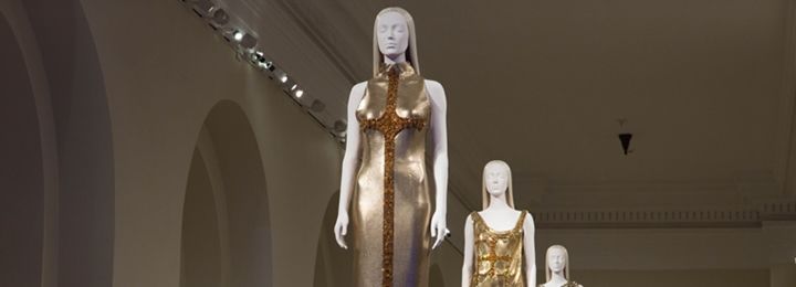 Featured here are five dresses from Gianni Versace's autumn/winter 1997–98 collection, which, like the pieces from his autumn/winter 1991–92 collection displayed in the crypt below the Great Hall stairs, were inspired by the striking mosaics of Ravenna's Byzantine monuments, including: the Arian Baptistry, the Basilica of San Vitale, the Chapel of Sant'Andrea, the Basilica of Sant'Apollinare Nuovo, the Mausoleum of Galla Placidia, and the Basilica of Sant'Apollinare in Classe. This influence is expressed in the fabric of the dresses, a nonwoven, metal-mesh material known as Oroton, which gives the illusion of intricate tesserae. The defining decorative element of the garments is an elaborate cross, the form of which was directly inspired by the gilded silver processional cross that introduces this gallery, which Versace discovered while visiting The Met exhibition The Glory of Byzantium (1997).