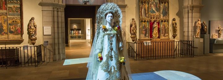 A popular Marian devotion that dates to the early Middle Ages but took root later in the period is the dressed Madonna and Child, a theme also explored at The Met Cloisters. It is probable that the two wood statues on the south wall of this gallery would have been adorned with costumes, gifts, or votive offerings, especially during processions. This devotion continues today, and several fashion designers have created garments for Madonna and Child sculptures. Featured in this gallery is an example by Yves Saint Laurent, designed for the Chapel of Notre-Dame de Compassion in Paris, and another by Riccardo Tisci, made for the Parish of Saint Peter the Apostle in Palagianello, Italy.