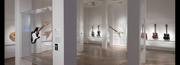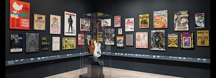 Many of the posters exhibited here are rare and represent iconic moments in rock music; a number of them feature performers and instruments seen throughout the exhibition.