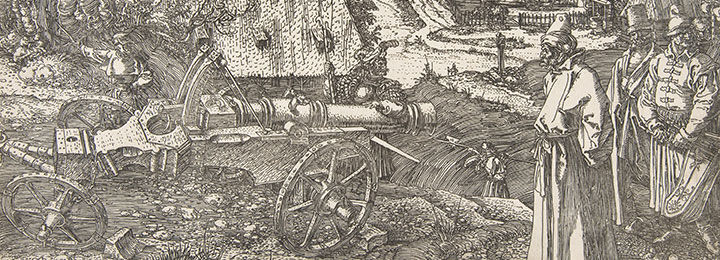 Some of the most prolific and accomplished printmakers in Germany experimented with etching in the early sixteenth century. Albrecht Dürer made six etchings. The Large Cannon, his final and most adept experiment in the medium, showed not only how the etched line could approximate the drawn one, but also how etching could be used to depict landscape to extraordinary effect.