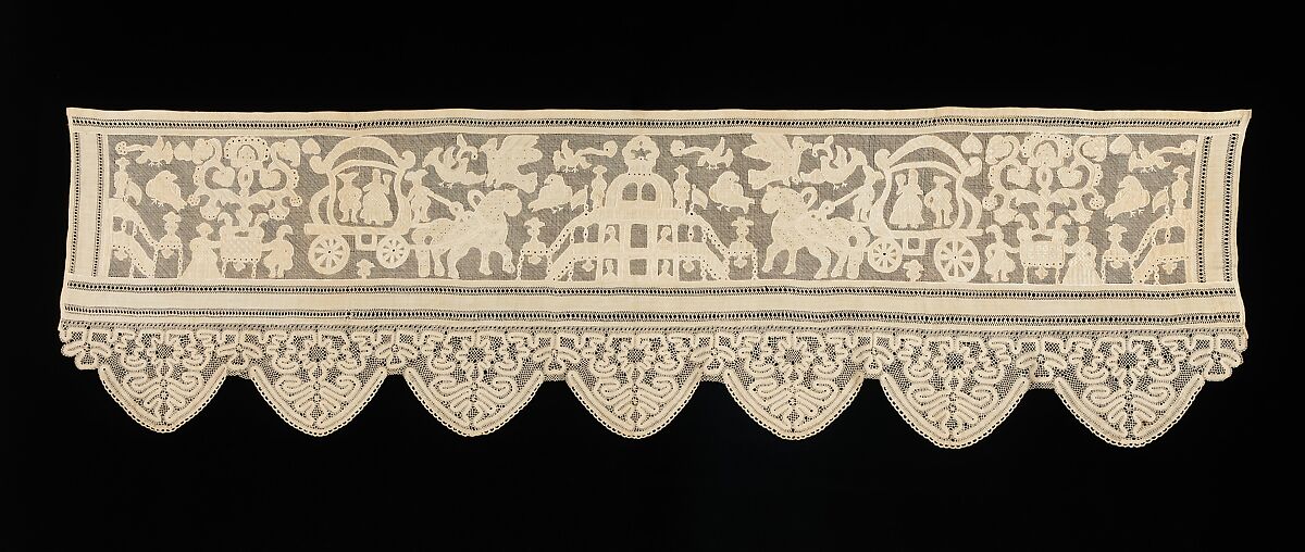 The intricacy of the work and size of the piece indicate this border belonged to an upper-middle class family of some importance. The depth of a bed curtain border indicated wealth and was handed down through generations. This example was likely part of a bride's trousseau. The motif depicts the Czar and Czarina in various settings including the Kremlin and horse-drawn coaches. The birds and flowering plant motifs bring good luck and fruitfulness to the couple.