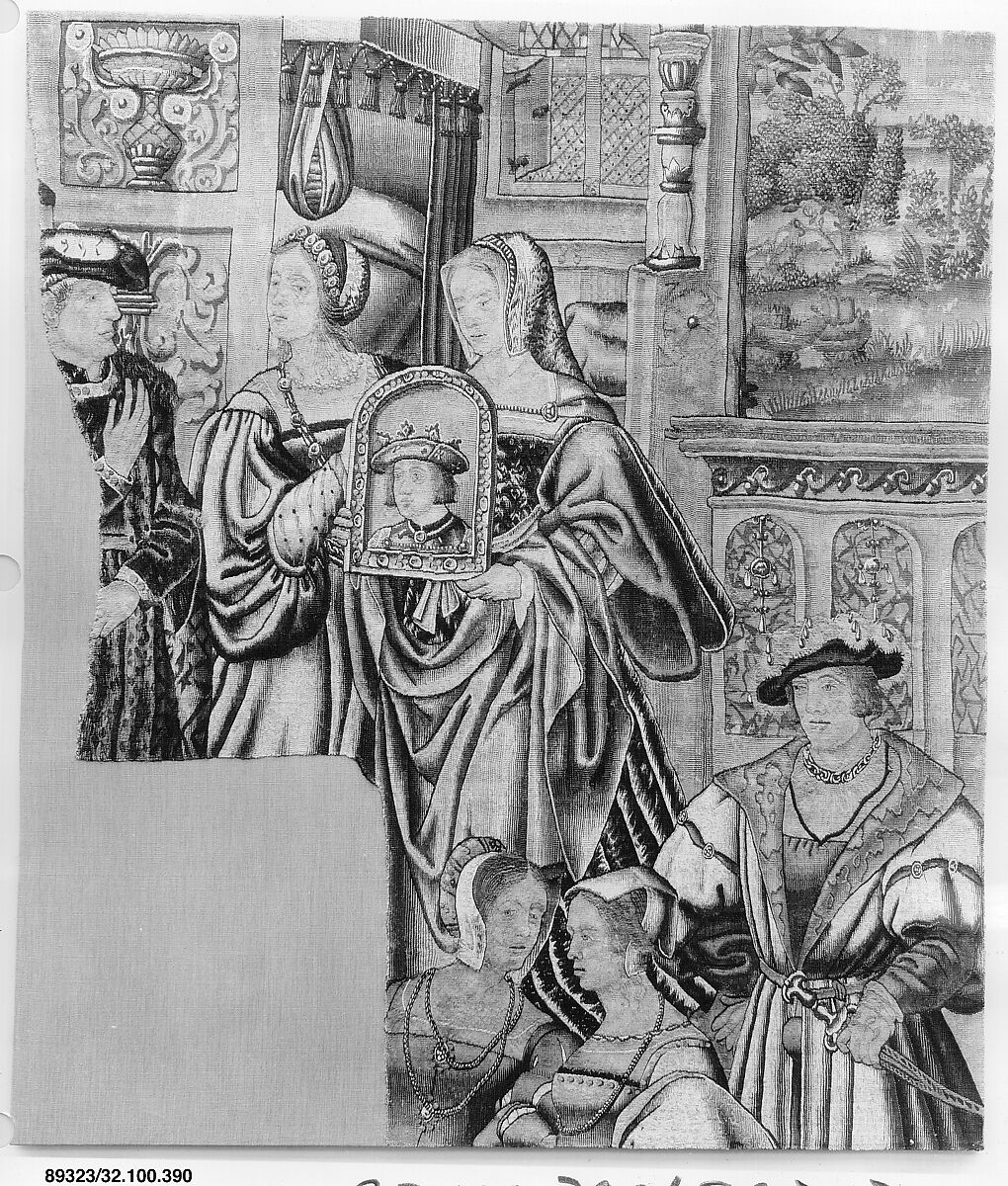 Despite its considerable size, this is a fragment cut from an even larger narrative tapestry of monumental scale. As such, the subject matter remains frustratingly opaque. Given the rich interior and courtly, contemporary fashions worn by the protagonists, past scholars have been tempted to identify this as a record of an actual historical event. It has been suggested, for example, as recording Margaret of Austria showing a portrait of her fiancé, Philibert II, Duke of Savoy, to her father, Emperor Maximilian I, before their 1501 marriage. Given the sixteenth-century convention to portray the protagonists of ancient, classical and Biblical histories- all popular in tapestry- in embellished versions of contemporary dress, however, this could more likely be a scene from such a fictive, and as yet unidentified, history.