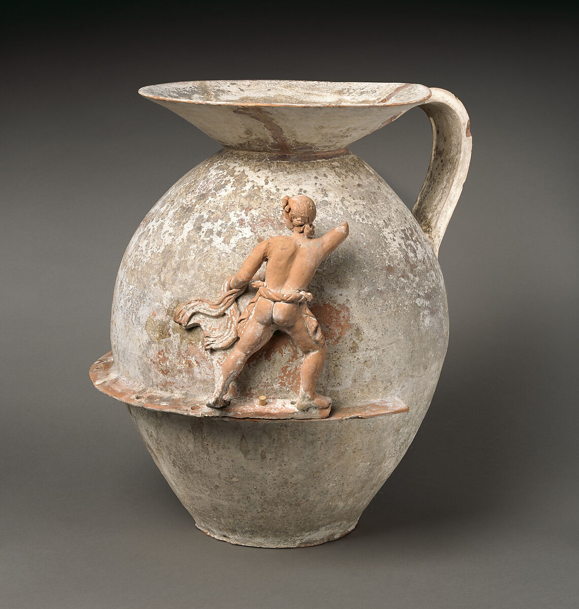 In its shape and decoration, this piece differs significantly from the vases of Greek derivation with which it was found. With its rotund, closed body and oblique neck, it is related to the indigenous Italic, Daunian form exhibited in the neighboring gallery of South Italian art. Instead of painted decoration, mold-made figures were fastened with pegs to the flange that serves as a ground-line. The surviving example belongs to a representation of the death of the Niobids. The reliefs shown close by were acquired with the vase but do not belong to it.