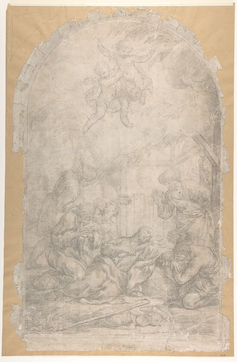 Manuela B. Mena Marqués points out that in the Roberto Longhi Archives in Florence there is a photograph, classed as school of Maratti, of a painting that corresponds in almost every detail, including the arched top, to the Metropolitan drawing. In the painting, however, two male spectators appear behind the standing turbaned figure on the right. Its high finish suggests it may be a study for an engraving, but the print does not seem to have been issued.Though the drawing has no traditional attribution to Ferri, in style it is typical of him.
