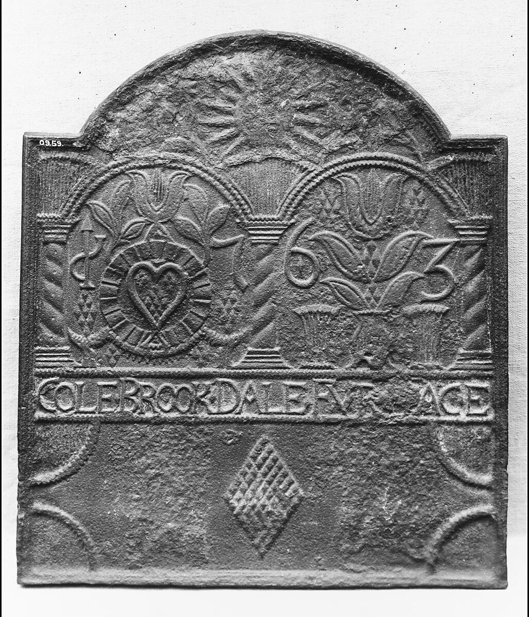 Iron firebacks protected the chimney’s masonry and reflected heat back into the room. This example features a central design of an arcade supported on twisted columns, interspersed with hearts and tulips. It was cast at Colebrookdale Furnace, the first iron foundry in the colony of Pennsylvania.