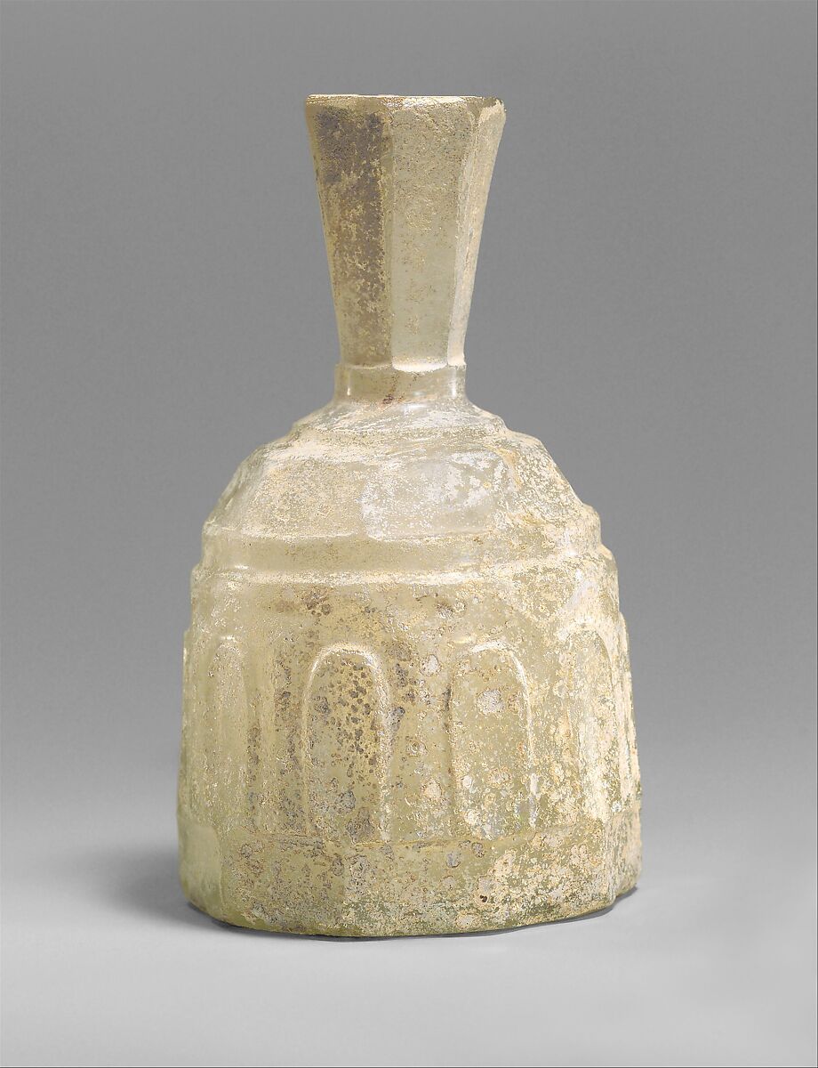 The shape of this bottle seems to have been popular in glass as well as metal and glazed pottery. Though it is hard to say which medium gave way to the other, this particular faceted variety with horizontal grooves marking the transitions between the different decorative sections of the vessel has especially close parallels in metal.