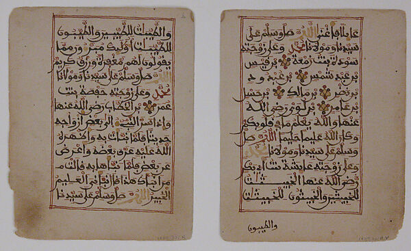 The production of these folios from a prayer manuscript can be dated and located by the form of calligraphy, ornament, and palette. The script, maghribi, is a variation of the classical script used in North Africa (specifically Morocco, Algeria, and Tunisia) and known for its angular and swirling characters. The text is a series of prayers containing invocations to the wives of the Prophet Muhammad and to Ibrahim (Abraham). The names Allah and Muhammad are highlighted in red or yellow, and rectangular bands and cartouches in blue and other colors mark separations in the text. The size of the book and its worn corners suggest constant use. The paper appears to be European; this is not unusual, since European paper was used extensively throughout North and sub-Saharan Africa during this period. The style of maghribi calligraphy, the distinct ornament and palette, and the presence of borders on each page point to nineteenth-century Morocco as the place of production.