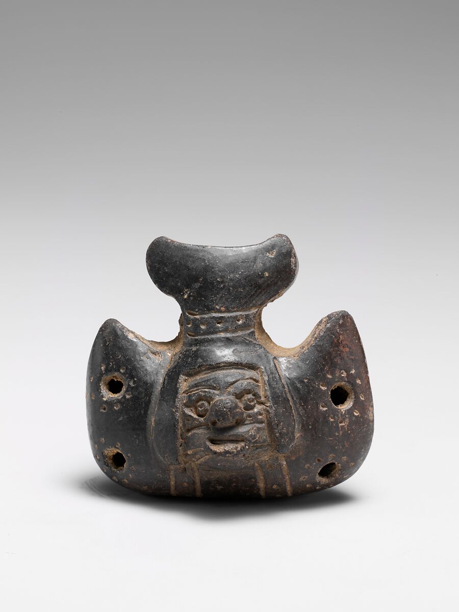 Flutes and bells are all that remain of many musical traditions of the Tairona people of the Sierra Nevada de Santa Marta region, Colombia. The importance of these metal, terracotta, and blackware instruments is evident in their carefully detailed incising and punctuation. The symbolic meanings of the effigies are obscure, and the relationship between the forms and their musical functions is unclear. It is believed that musical effigies served as talismans and were played to link the mortal and immortal realms.