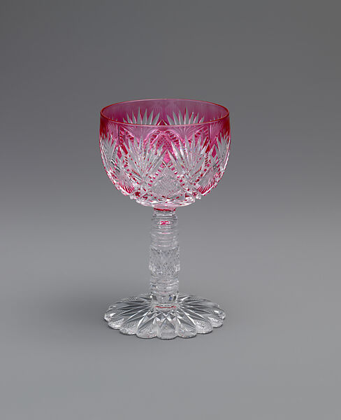 The glass factories founded by Alsatian émigré Christian Dorflinger were arguably among the most significant glass factories in operation from the mid to late nineteenth century. His first factory was in Brooklyn, New York, from which he relocated his operations to White Mills, Pennsylvania, where this object was made. His products were renowned both for the fine quality of the glass and for their accomplished cutting. This wine glass is exceedingly rare with the bowl made of cranberry-colored glass cased over colorless glass and cut in the Parisian pattern, the design identified by the row of fans alternating with cross-hatched diamonds framed by double line miter cuts, and an elaborately cut stem and foot. One of the most complex cut patterns produced by the firm, it was patented by John S. O’Connor, head of Dorflinger’s glass cutting department, on May 4, 1886, and assigned to C. Dorflinger & Sons. The Museum has in its collection a very similar wine glass which descended in the family of Christian Dorflinger (1972.232.2); this one is made entirely of colorless glass, but the stem is identical.