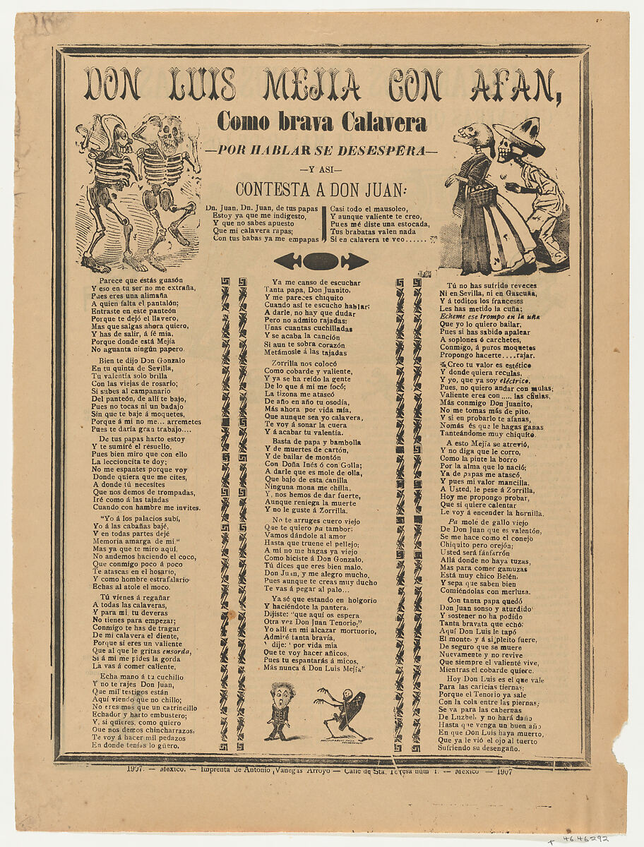- Title: Broadsheet relating to Don Luis Mejia and Afan, a corrido (ballad) in the bottom section