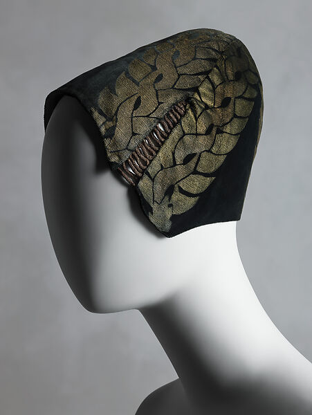 This work of art is currently on loan to the museum.Gallenga’s prints with varied shades of metallic pigment imitate the sheen of metallic threads and suggest the patina of age. Her technique produced a unique effect that did not immediately reveal its precise method of application; as one contemporary fashion reporter described, the designs “did not seem painted nor yet woven.” The patterns were block printed, but Gallenga maintained efforts to keep her process secret, involving only a small number of her staff in this step. When her business manager Amato Amati introduced Gallenga’s fashions to an American audience through an article in Vogue in 1916, he erroneously described the prints as “stenciled,” further contributing to the mystery surrounding her technique. While tea gowns, evening dresses, and capes made from these signature textiles are well known, accessories are rare.