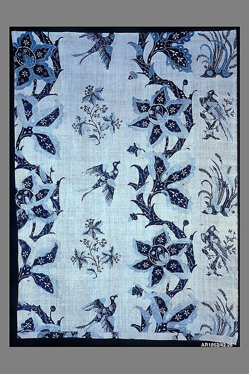 Blue-resist textiles are characterized by naturalistic designs in dark and light shades of indigo blue on a loosely woven white cotton ground. These designs were made by dipping the cloth in an indigo bath, rather than trying to print indigo directly onto the cloth. The repeating figures on blue-resist fabric were made by first covering areas of the white ground with wax that was sometimes mixed with other ingredients such as clay, starch and minerals that blocked (resisted) the penetration of the indigo dye. The largest areas of white were probably reserved by painting the wax freehand onto the white fabric, which had been lightly marked with the pattern that was to remain clear of the wax and therefore be dyed blue. The marking of the pattern could have been done with a wooden printing block or with a stencil. The first bath would dye the entire unwaxed pattern a light blue. The dyer then waxed over some of the light blue areas of the design and drew in wax the fine lines that defined certain details, called "pencil work" in the period. After penciling with wax was completed, the entire piece went into the indigo bath a second time, which turned all the still uncovered areas the deeper shade of blue.