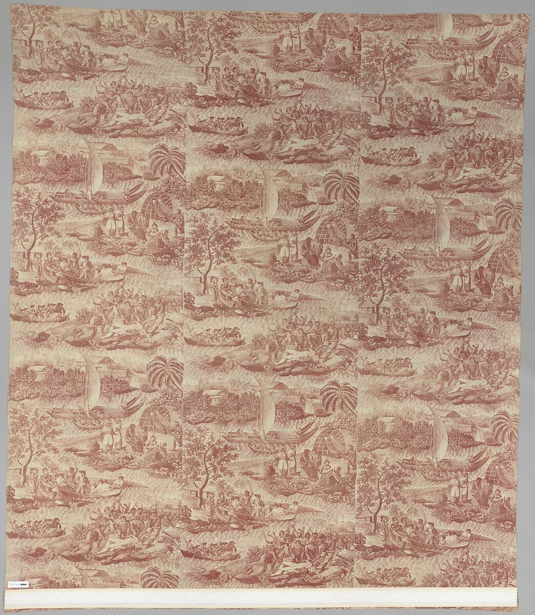 The quilt’s two printed cottons are well documented. The top is printed with trails of exotic flowers that may have been copied from the designs of Jean Pillement (1728-1808), who published books of ornaments in what was at the time considered to be "the Chinese manner." These designs were used by textile printers, painters, and decorators. Although Pillement was French, he spent much of his working life in London, where many of his designs were first published. The fabric was copperplate-printed at the Bromley Hall Printworks during the period the firm was being operated by Joseph Talwin and Joseph Foster. It is definitively identified by a paper impression of the print that is in the Victoria & Albert Museum’s collection of Bromley Hall papers. The paper impression is inscribed "P. 13 Talwin & Foster," and, given that Talwin and Foster ran the firm together only between 1785 and 1790, the fabric must have been printed during those years. The backing fabric, made of a less tightly woven cotton, also dates from the 1780s. It is printed with scenes illustrating Captain James Cook’s visits to and death in the Sandwich Islands (the former name of the Hawaiian Islands). Some of the scenes are copied from engravings in Captain Cook’s books about his travels. He was killed by native Hawaiians at Owhyhee on February 14, 1779, and the fabric, which served as one of many memorials to him, was probably printed soon after that date.