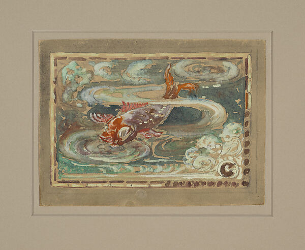 Several of Tiffany's early windows incorporate fish, often with the swirling water rendered in both lead lines and striations in the glass. The carp and the asymmetrical composition recall Japanese art, and the sinuous curves of the frothy rippling water suggest elements of Art Nouveau.