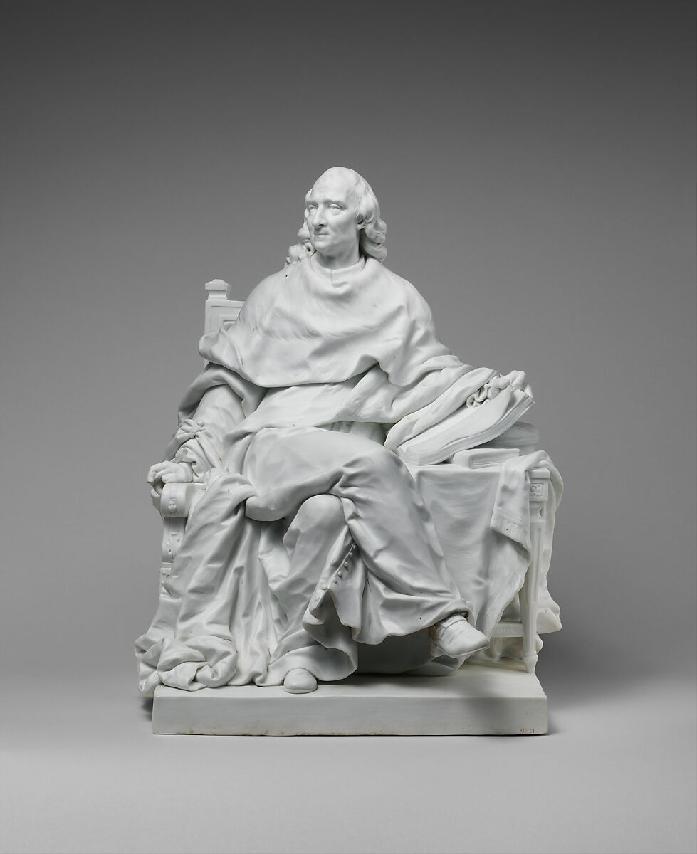 Louis XVI’s biscuit figure of Montesquieu was displayed on a large round table in his private library at Versailles, along with figures of Pierre Corneille (French, 1606–1684), Henri François d’Aguesseau (French, 1668–1751), Jean de La Fontaine (French, 1621–1695), Mathieu Molé (French, 1584–1656), and Molière (French, 1622–1673), all on blue- and- gold porcelain bases. Other porcelain figures of the “Great Men” were placed on console tables and on a mantelpiece in other rooms in Versailles.[10] Louis XVI employed porcelain figures of the “Great Men” as diplomatic gifts, most notably to Gustav III (1746–1792), king of Sweden,[11] and to Prince Henry of Prussia (1726–1802).[12] The prominence thus accorded to these figures can be read as reflecting a growing acceptance of porcelain as a serious sculptural medium. While the factory began producing accomplished biscuit figures and groups after compositions by François Boucher (French, 1703–1770) and Étienne- Maurice Falconet (French, 1716–1791) in the 1750s, as well as larger-scale busts of the French monarchs in succeeding decades, the “Great Men” series displays a degree of ambition surpassing that found in other works.