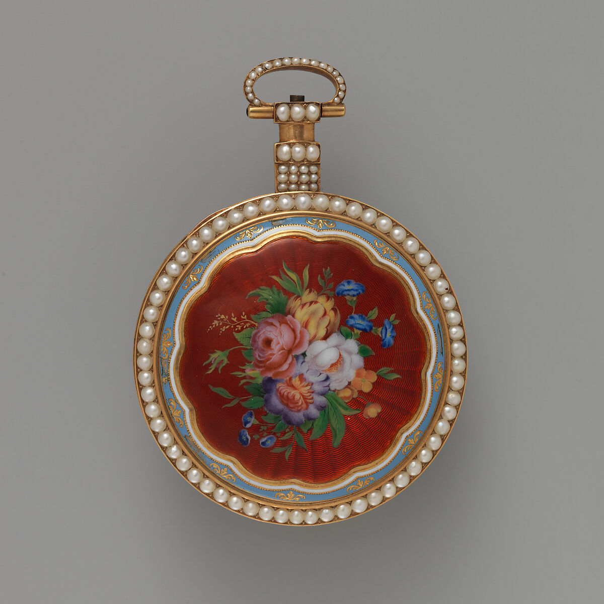 - Medium: Case of gold, enamel, and pearls, with floral design; jeweled movement, with ruby cylinder escapement