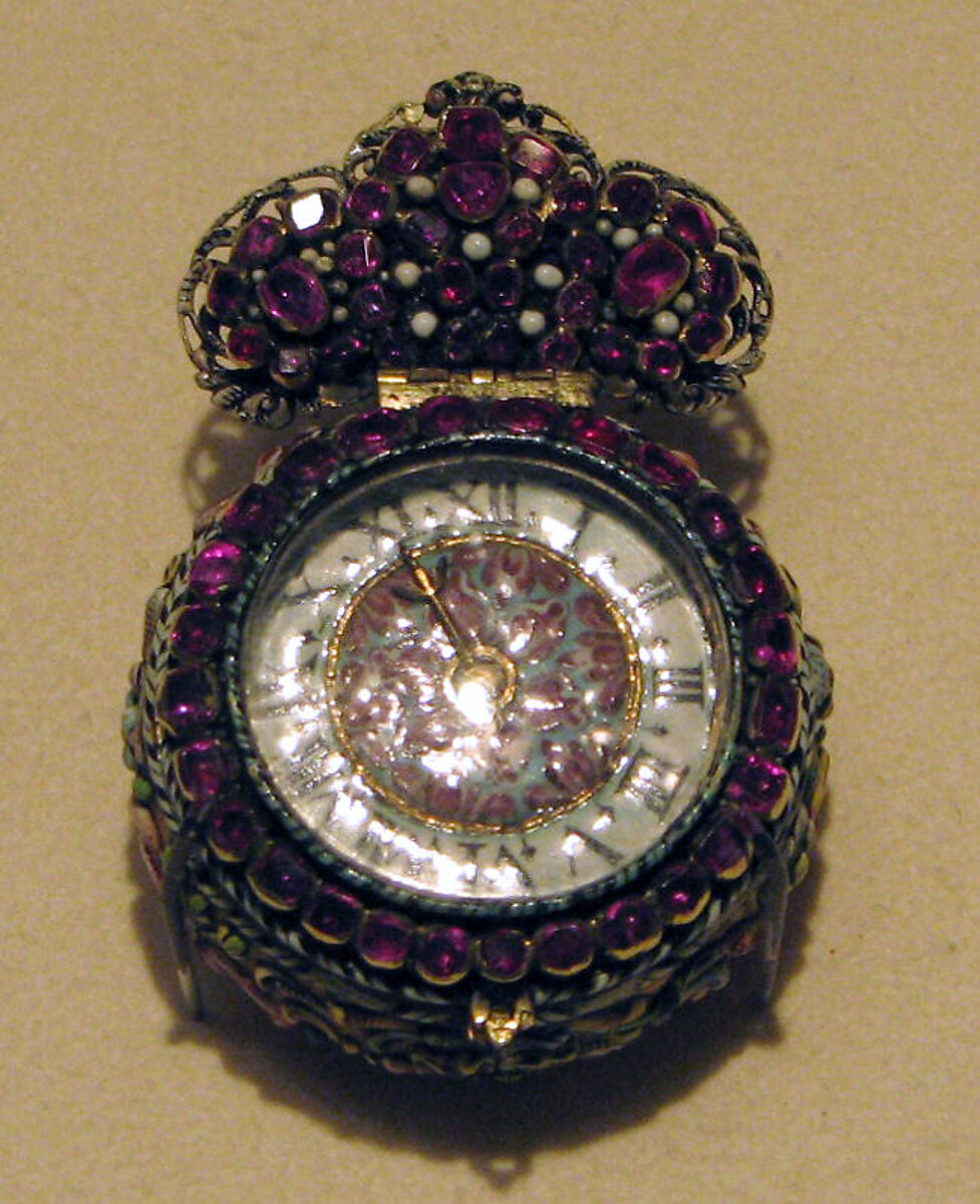 - Medium: Case: gold, and painted enamel set with garnets; Movement: gilded brass and steel, partly blued