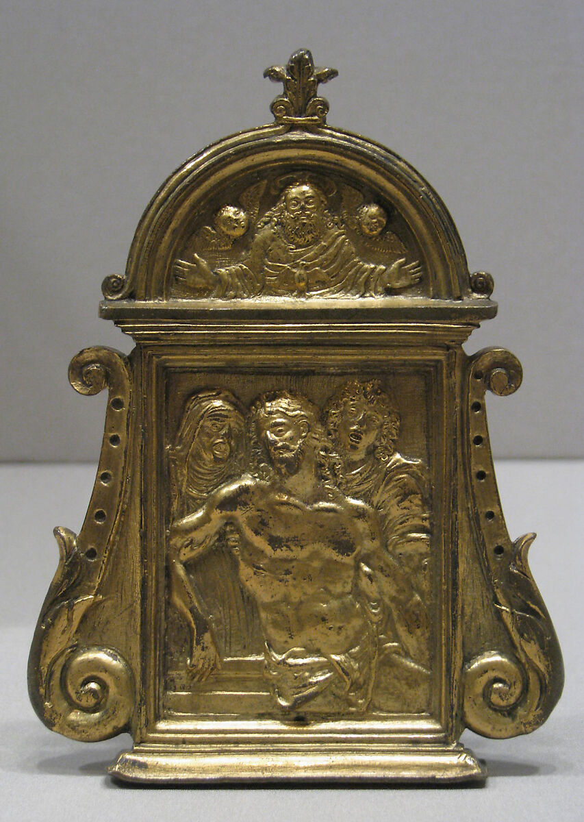 The plaquette, surmounted by a smaller plaquette with God the Father, is mounted as a pax.