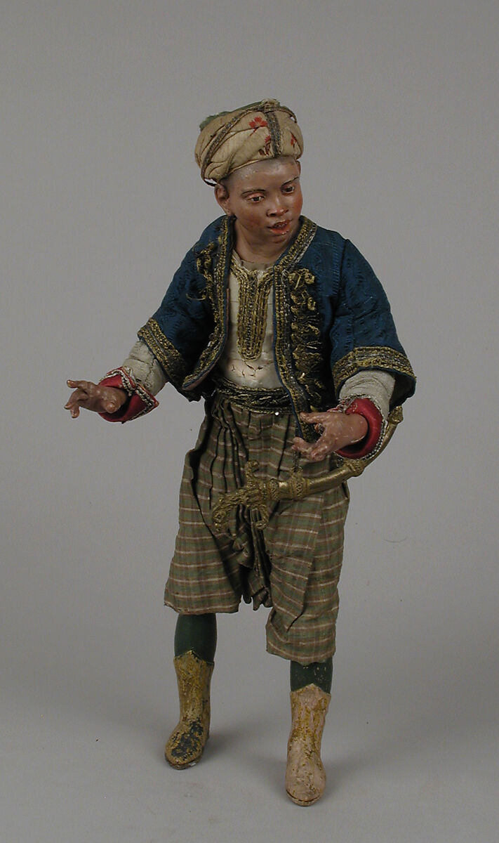 In 1964, Loretta Hines Howard generously presented to the Museum over 140 Neapolitan crèche figures, dating from the second half of the eighteenth century. The varied assortment includes figures from the three traditional scenes of a complete Neapolitan presepio: the Nativity, with angels, shepherds, and sheep; the procession of the three Magi, with their colorful retinue of attendants; and the varied and gay crowd of country and town people thronging the tavern, or inn, of Bethlehem — the diversorium mentioned by St. Luke, where on the Holy Night there was no place for Mary and Joseph. Averaging between twelve and fifteen inches in height, according to the position they were to take in perspective in the stage set, the figures are pliable and can be given poses at will, according to their facial expressions. Their bodies are made of tow and wire, their arms and legs are finely carved of wood, and their heads and shoulders are modeled of terracotta and accurately finished. Their attire, often enriched by accessories, jewels, and embroideries, is a sheer joy for the lover of folklore and eighteenth-century costumes.