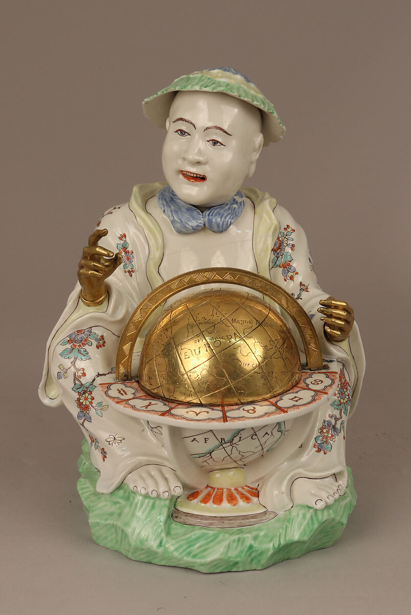 In the seventeenth and eighteenth centuries, Asian countries were a source of considerable fascination and allure to Europeans. Asian figures were frequently chosen as subjects to decorate ceramics and other works of art produced in Europe, but these depictions were rarely based on firsthand knowledge and thus were usually fanciful. This figure of a Chinese man seated with a globe was intended to be decorative, but also may allude to China’s sophisticated understanding of astronomy during this period.